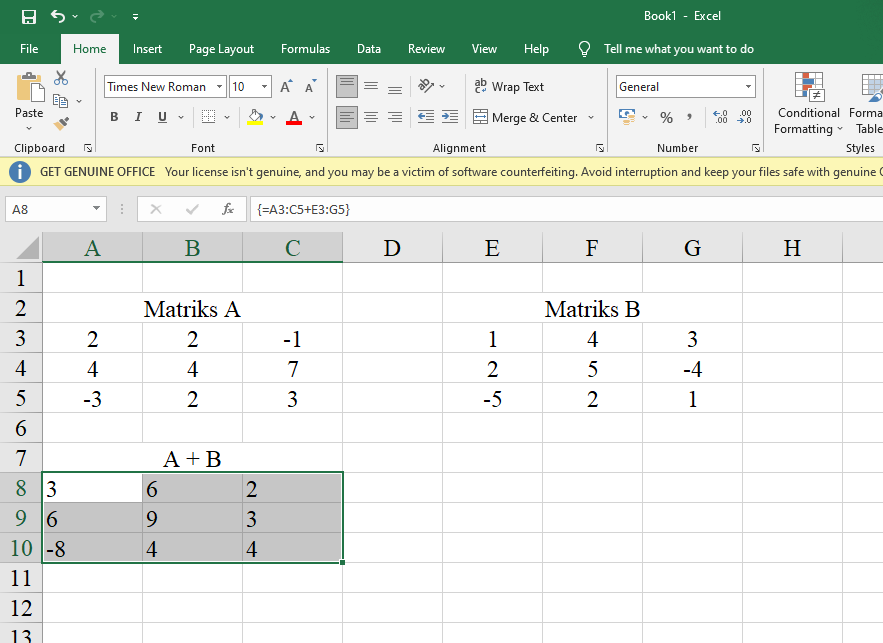 Maka hitunglah matriks A + B, menggunakan microsoft excel